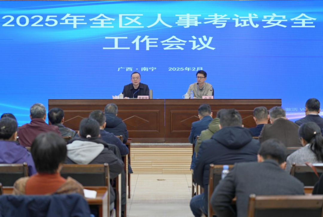 会议深入分析了当前全区人事考试安全形势,对做好2025年人事考试工作作出部署。今年人事考试工作的总体目标是:坚持以习近平新时代中国特色社会主义思想为指导,全面学习贯彻党的二十大和二十届二中、三中全会精神,深入贯彻落实习近平总书记关于做好新时代人才工作的重要思想和关于广西工作论述的重要要求,落实全国、全区人社工作会议部署,突出实干为要、创新为魂,用业绩说话、让人民评价,加强人事考试规范化建设,防范人事考试风险,确保人事考试安全,为奋力谱写中国式现代化广西篇章提供强有力的人才支撑。