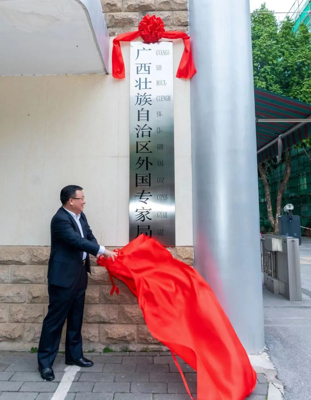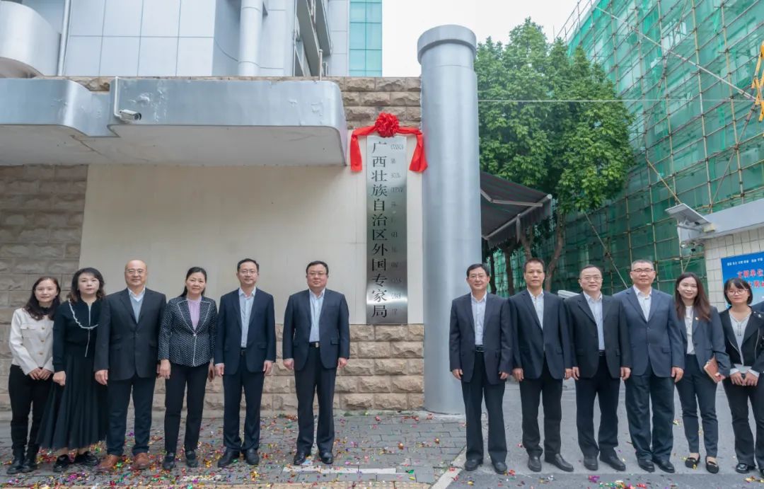 广西壮族自治区人力资源和社会保障厅党组书记、厅长唐标文为“广西壮族自治区外国专家局”揭牌