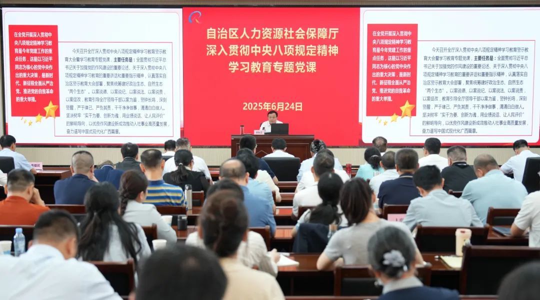 6月24日,自治区人力资源社会保障厅召开深入贯彻中央八项规定精神学习教育警示教育大会暨学习教育专题党课,全面贯彻习近平总书记关于加强党的作风建设的重要论述、关于深入贯彻中央八项规定精神学习教育的重要讲话和重要指示精神,认真落实自治区深入贯彻中央八项规定精神学习教育警示教育大会要求,树牢“实干为要、创新为魂,用业绩说话、让人民评价”的鲜明导向,结合近年来中央和自治区查处的违反中央八项规定精神典型案例深入剖析,以案说德、以案说纪、以案说法、以案说责、以案促改,教育引导全厅领导干部以案为鉴,警钟长鸣,深刻警醒,严于律己、严负其责,以优良作风建设成效推动全区人社事业高质量发展,奋力谱写中国式现代化广西篇章。厅党组书记、厅长唐标文主持全厅警示教育大会,并以“深入贯彻中央八项规定精神,为全区人社事业高质量发展提供坚强作风保障”为主题,讲授专题党课。