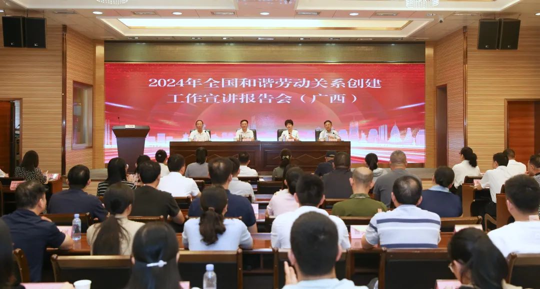 宣讲报告会还宣读了《广西和谐劳动关系倡议书》。自治区劳动关系协调三方成员单位处室负责人,部分区直企业代表在南宁主会场参加报告会,各市劳动关系协调三方成员单位分管领导及相关业务科室负责人在各市分会场以视频方式参加报告会。