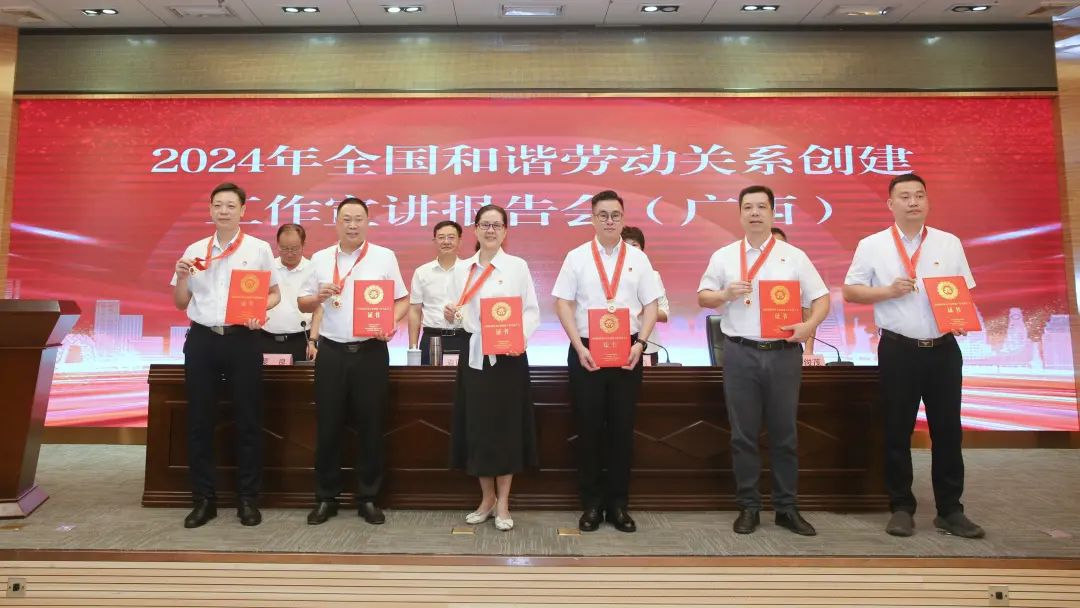 会上,自治区相关部门领导为广西受表彰的全国和谐劳动关系创建工作先进集体和先进个人颁发牌匾、证书、奖章。自治区人力资源社会保障厅劳动关系处、防城港市港口区沙潭江街道办事处荣获第一届全国和谐劳动关系创建工作先进集体,柳州市总工会韦红革等8人荣获第一届全国和谐劳动关系创建工作先进个人,6名先进个人代表作事迹宣讲。