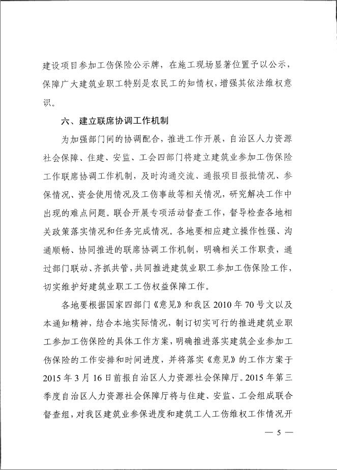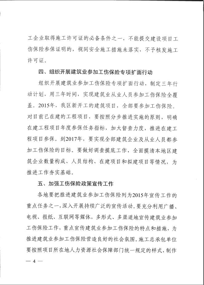 一、完善符合建筑业特点的工伤保险参保政策,大力扩展建筑企业工伤保险参保覆盖面。建筑施工企业应依法参加工伤保险。针对建筑行业的特点,建筑施工企业对相对固定的职工,应按用人单位参加工伤保险;对不能按用人单位参保、建筑项目使用的建筑业职工特别是农民工,按项目参加工伤保险。房屋建筑和市政基础设施工程实行以建设项目为单位参加工伤保险的,可在各项社会保险中优先办理参加工伤保险手续。建设单位在办理施工许可手续时,应当提交建设项目工伤保险参保证明,作为保证工程安全施工的具体措施之一;安全施工措施未落实的项目,各地住房城乡建设主管部门不予核发施工许可证。
