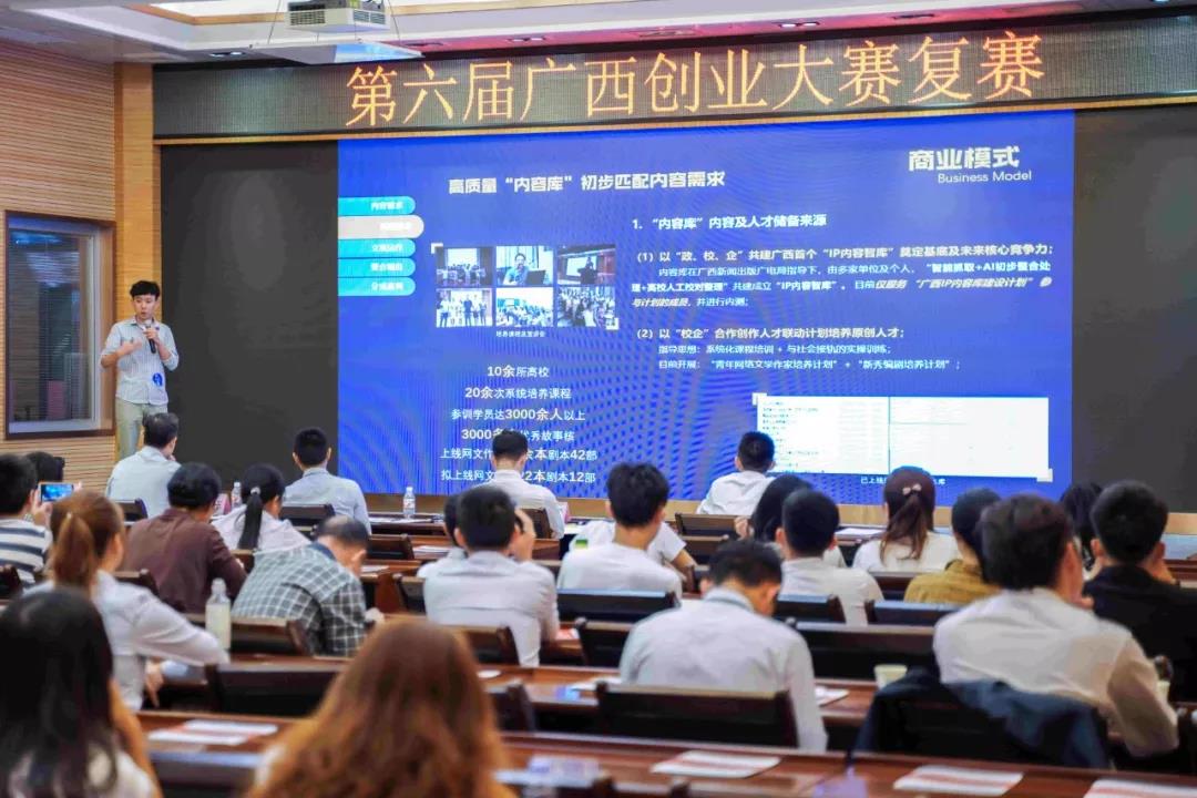 第六届广西创业大赛由自治区人力资源社会保障厅、自治区发改委、自治区教育厅、自治区科技厅、共青团广西区委共同主办。本届大赛自报名启动以来,现代服务业、现代特色农业、新兴产业、文化创意和综合类五大行业赛道吸引1060个创业项目报名参赛,参赛项目来自广西、北京、上海、广东、湖北、江西、吉林等21个省份和直辖市,其中广西大学、广西民族大学、桂林电子科技大学、中国矿业大学、武汉大学等58所区内外高等院校组织了420个大学生创业项目报名参赛。初赛阶段采用商业计划书评审的形式,共评出100个初创组创业项目、50个成长组创业项目晋级复赛。