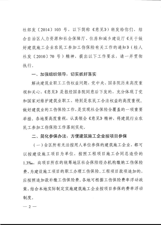 转发人力资源社会保障部 住房城乡建设部 安全监管总局 全国总工会关于进一步做好建筑业工伤保险工作意见的通知(桂人社发〔2015〕13号)