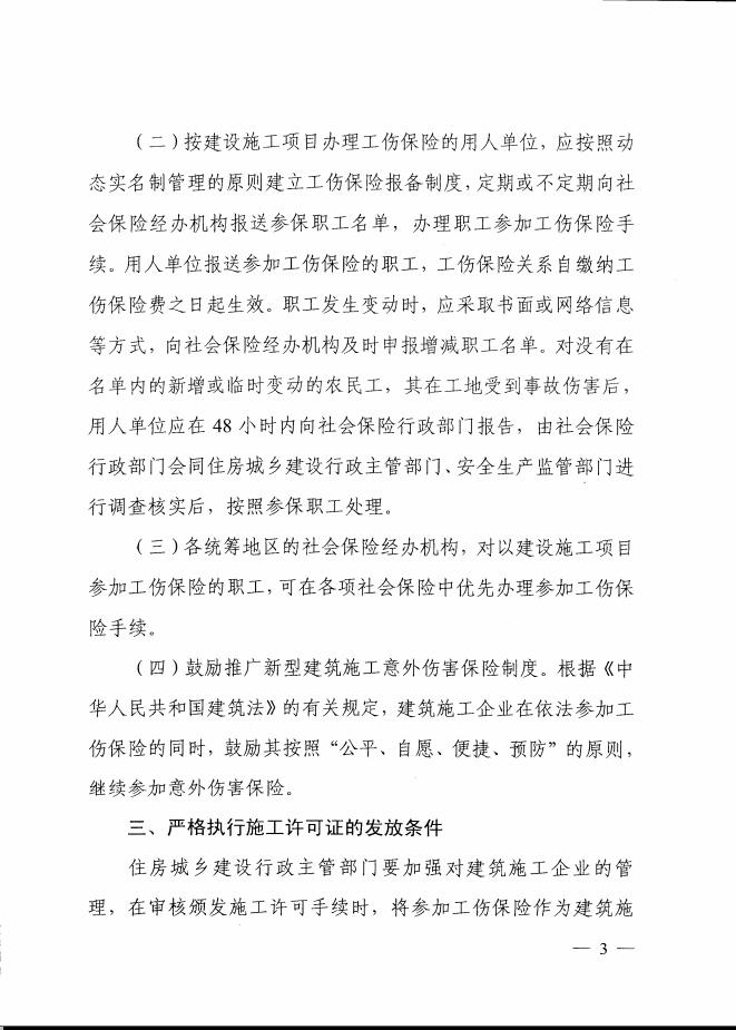 一、完善符合建筑业特点的工伤保险参保政策,大力扩展建筑企业工伤保险参保覆盖面。建筑施工企业应依法参加工伤保险。针对建筑行业的特点,建筑施工企业对相对固定的职工,应按用人单位参加工伤保险;对不能按用人单位参保、建筑项目使用的建筑业职工特别是农民工,按项目参加工伤保险。房屋建筑和市政基础设施工程实行以建设项目为单位参加工伤保险的,可在各项社会保险中优先办理参加工伤保险手续。建设单位在办理施工许可手续时,应当提交建设项目工伤保险参保证明,作为保证工程安全施工的具体措施之一;安全施工措施未落实的项目,各地住房城乡建设主管部门不予核发施工许可证。
